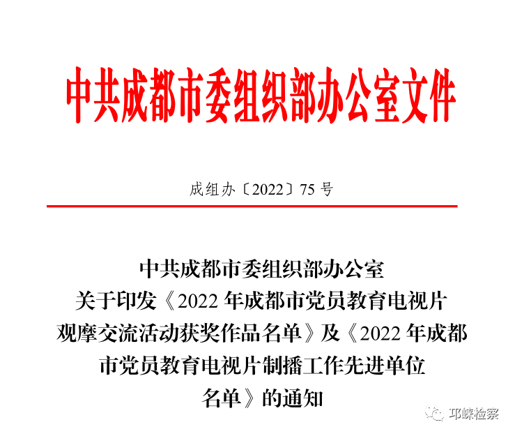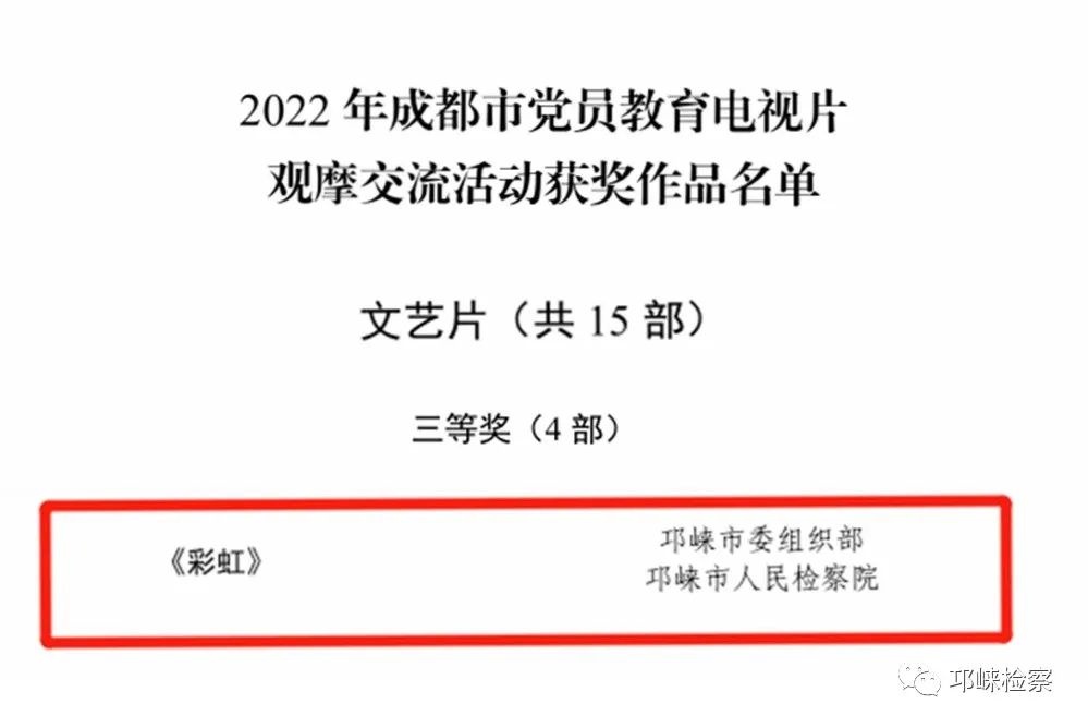 邛崍市檢察院拍攝的黨員教育短片《彩虹》,榮獲成都市委組織部2022年成都市黨員教育電視片觀摩交流活動文藝片類三等獎。
